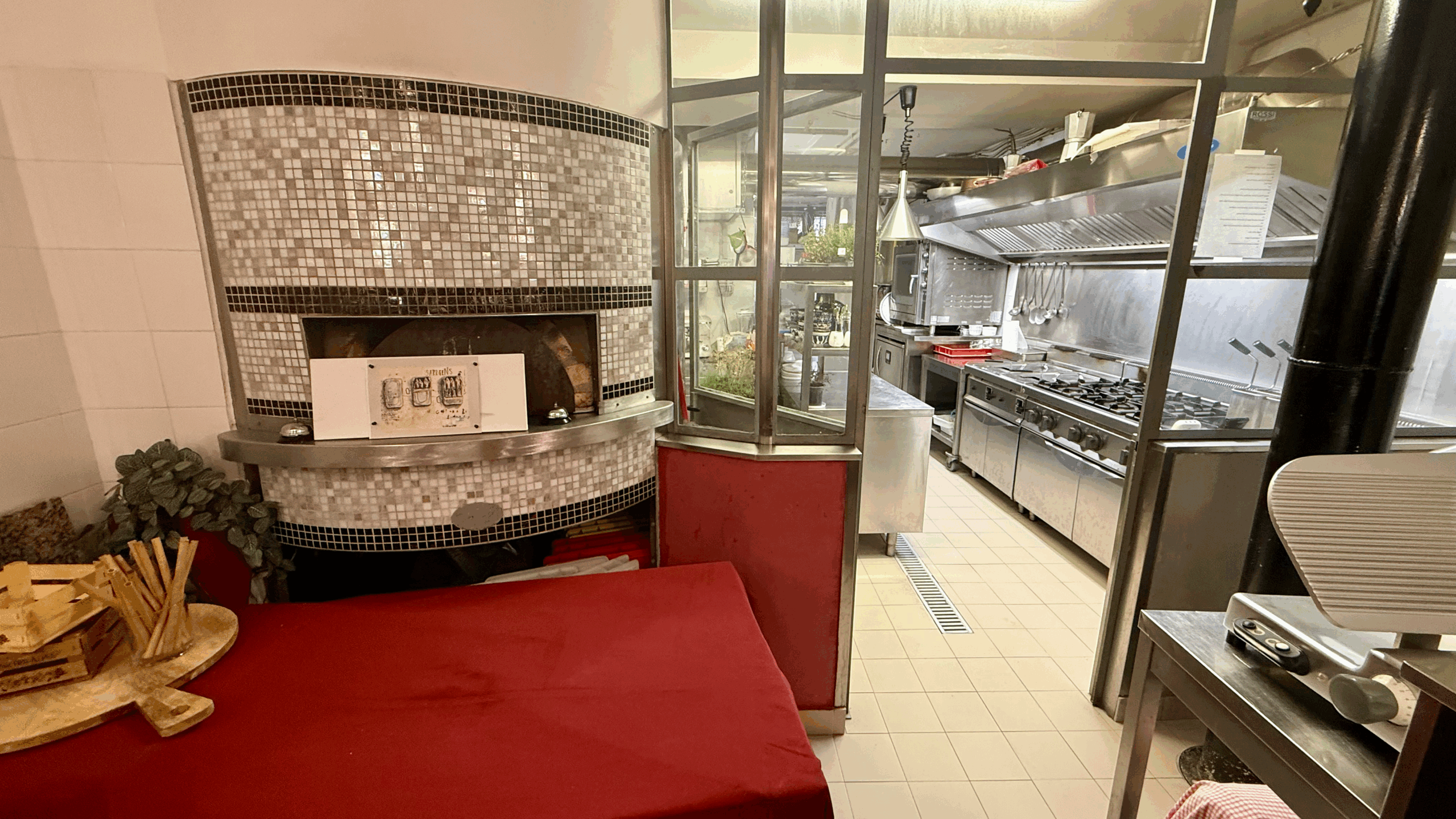 La cucina a vista dona trasparenza e atmosfera, affiancata da un bancone bar accogliente e da una zona forno perfettamente funzionante, ideale per pizze fragranti e piatti sfiziosi.