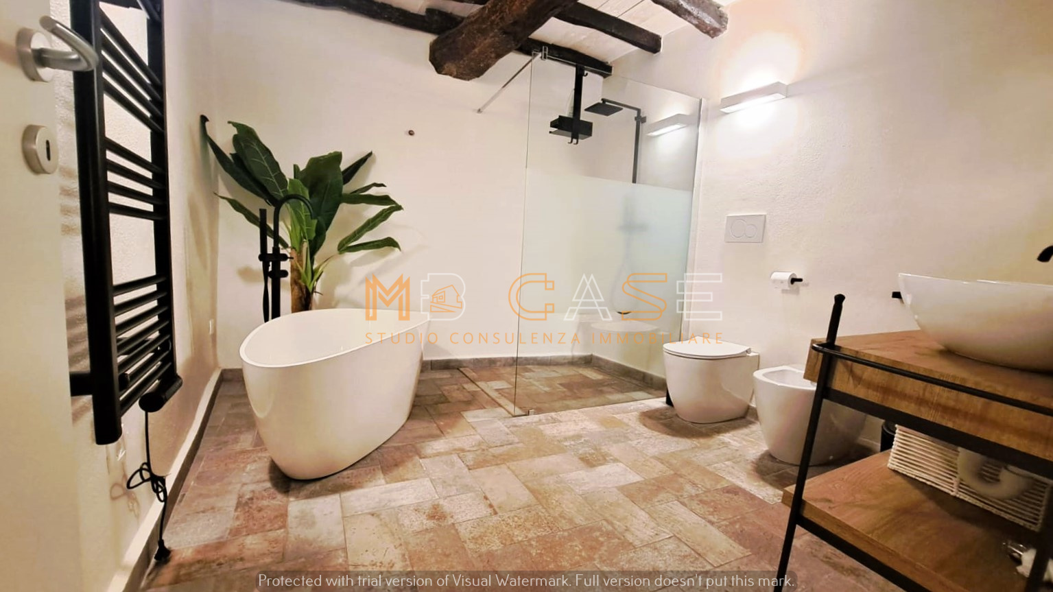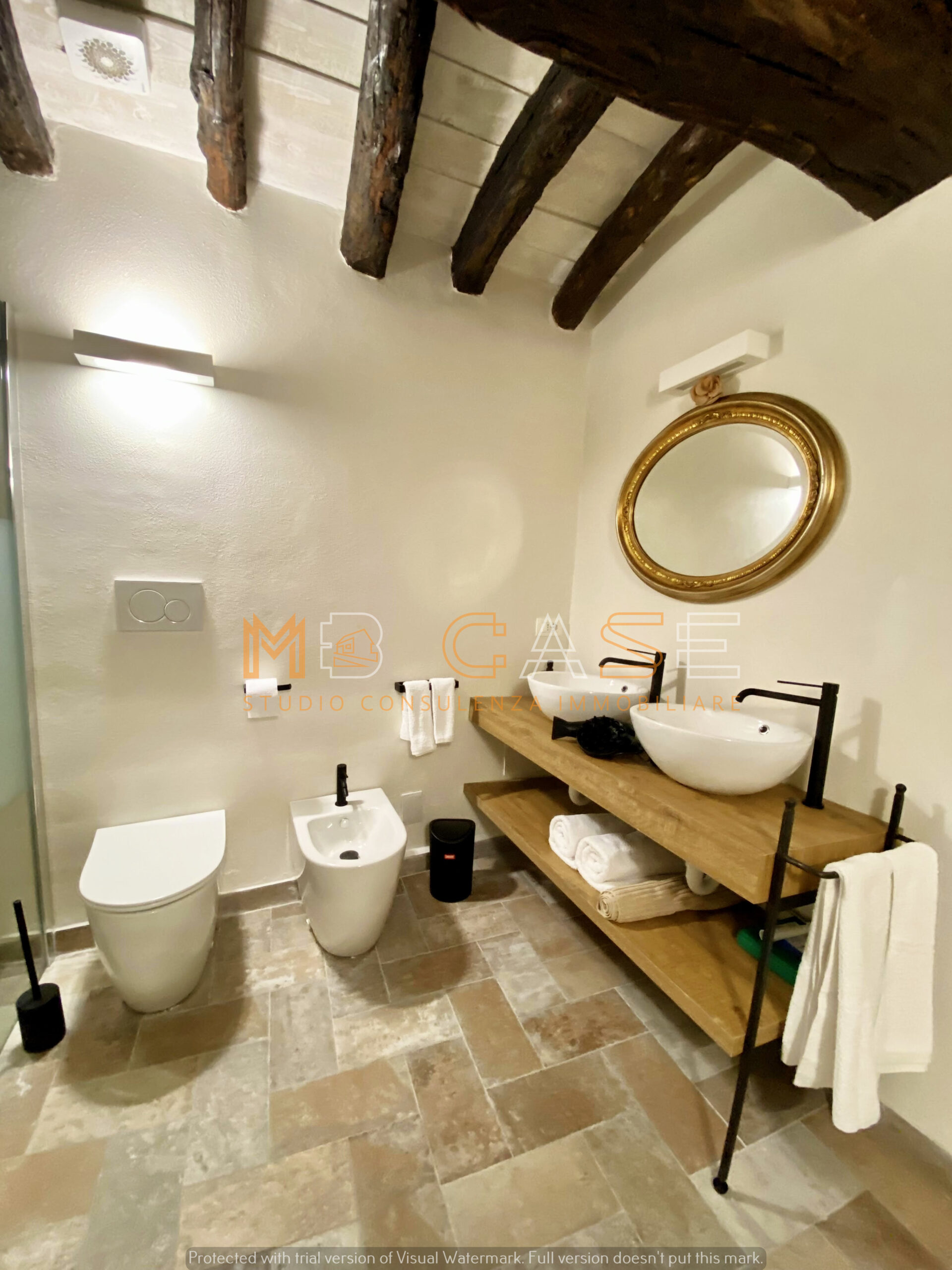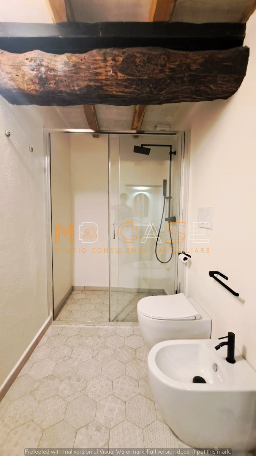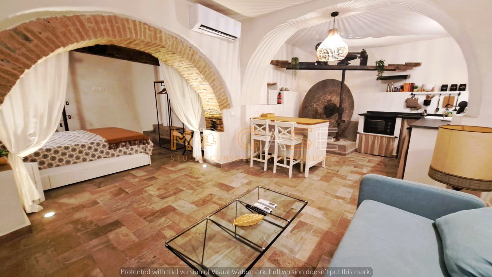 Appartamento 1 (piano terra): ampio monolocale con camera separata da arco in pietra, bagno elegante con doppio lavandino, vasca e doccia, cucina con piano in ardesia e dettagli storici come una splendida macina recuperata e perfettamente integrata.