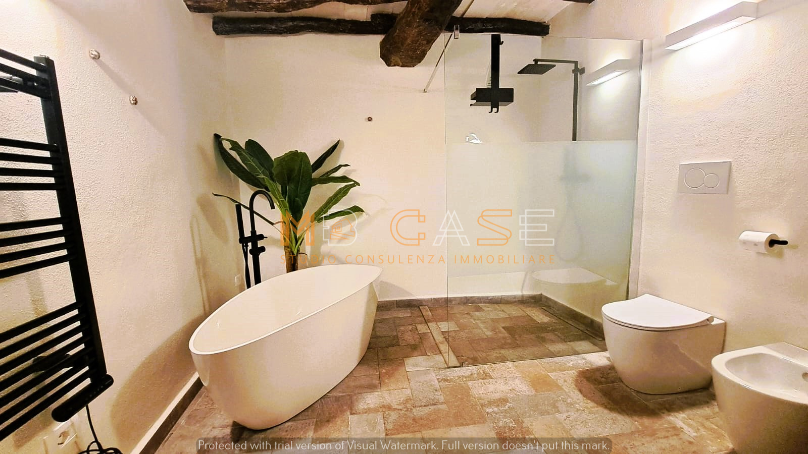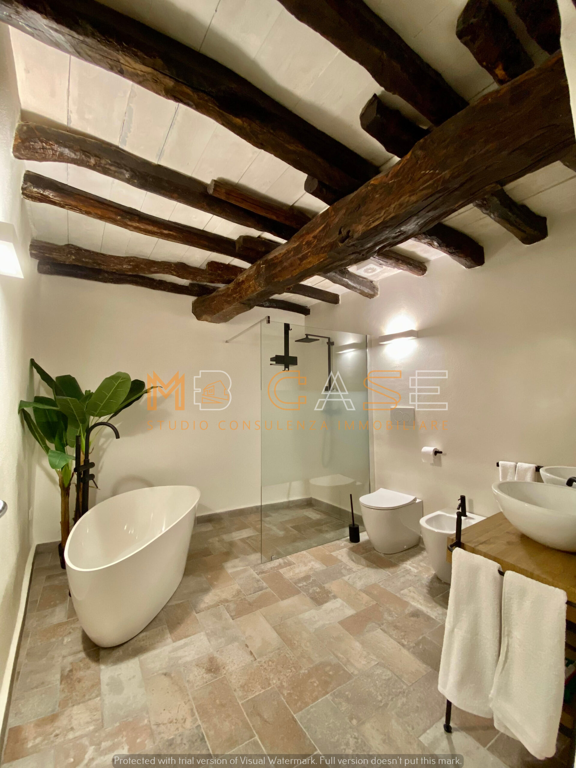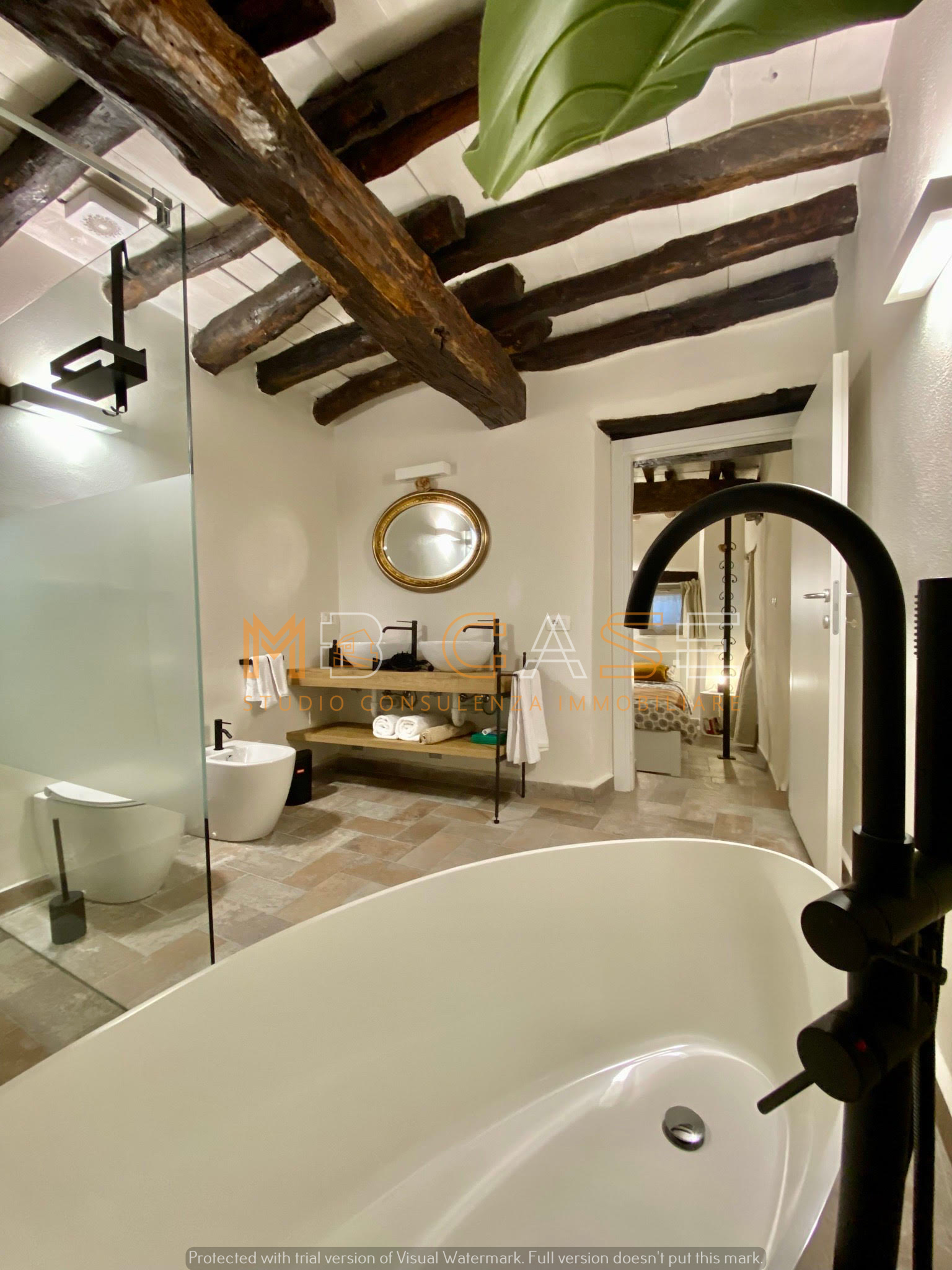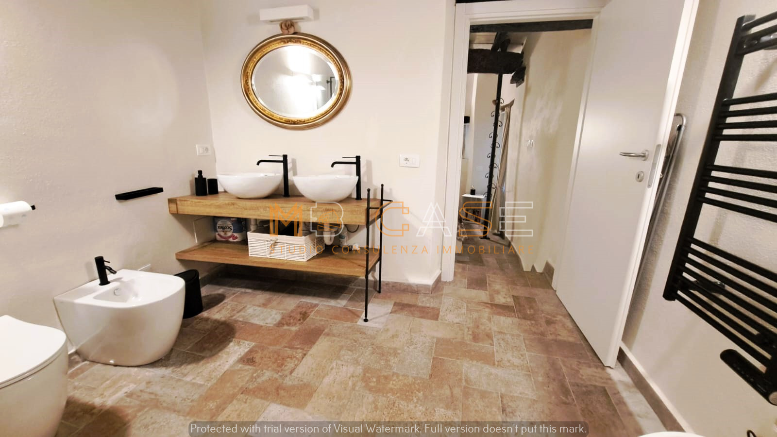 Appartamento 1 (piano terra): ampio monolocale con camera separata da arco in pietra, bagno elegante con doppio lavandino, vasca e doccia, cucina con piano in ardesia e dettagli storici come una splendida macina recuperata e perfettamente integrata.