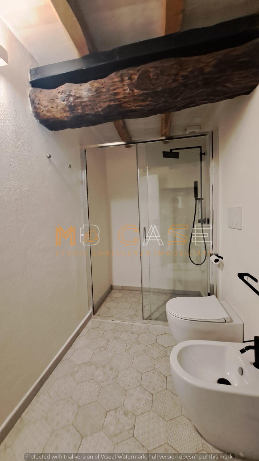 Appartamento 2 (su due livelli): disimpegno d’ingresso, camera da letto con inserti in pietra e scuri originali, bagno con doccia spaziosa, cucina con travi a vista al piano superiore e accesso diretto a una grande terrazza panoramica.